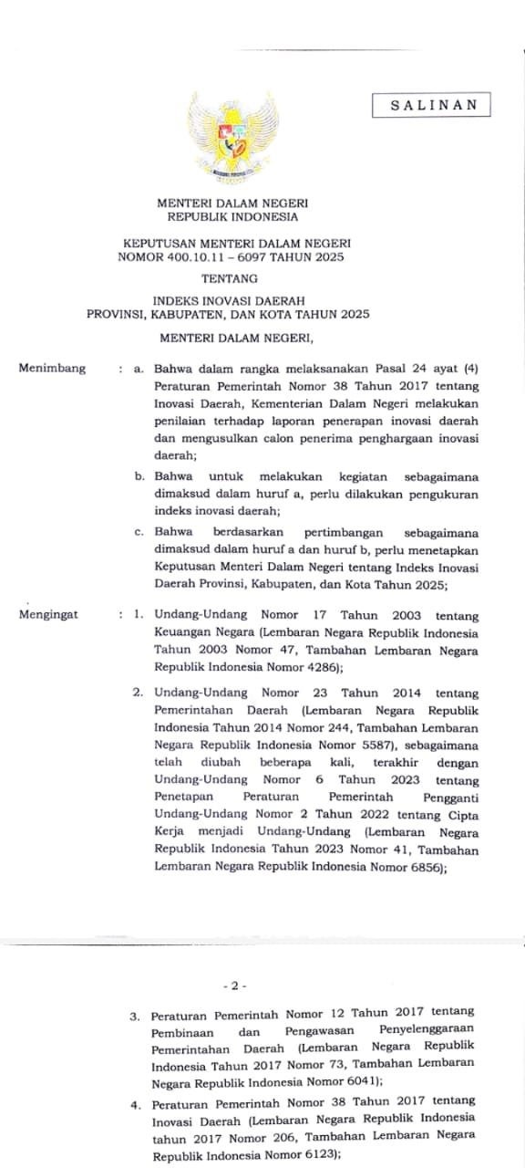 POROSNEWS.ID, Jakarta – Berdasarkan Surat Keputusan Menteri Dalam Negeri Nomor : 400.10.11-6098 Tahun 2025 Tentang penerimaan penghargaan Innovative Goverment Award tahun 2025, dan Surat Keputusan Nomor : 400.10.11-6097 tahun 2025 tentang Indeks Inovasi Daerah Provinsi, Kabupaten, Dan Kota tahun 2025, dan Boalemo salah satu kabupaten yang berinovatif.