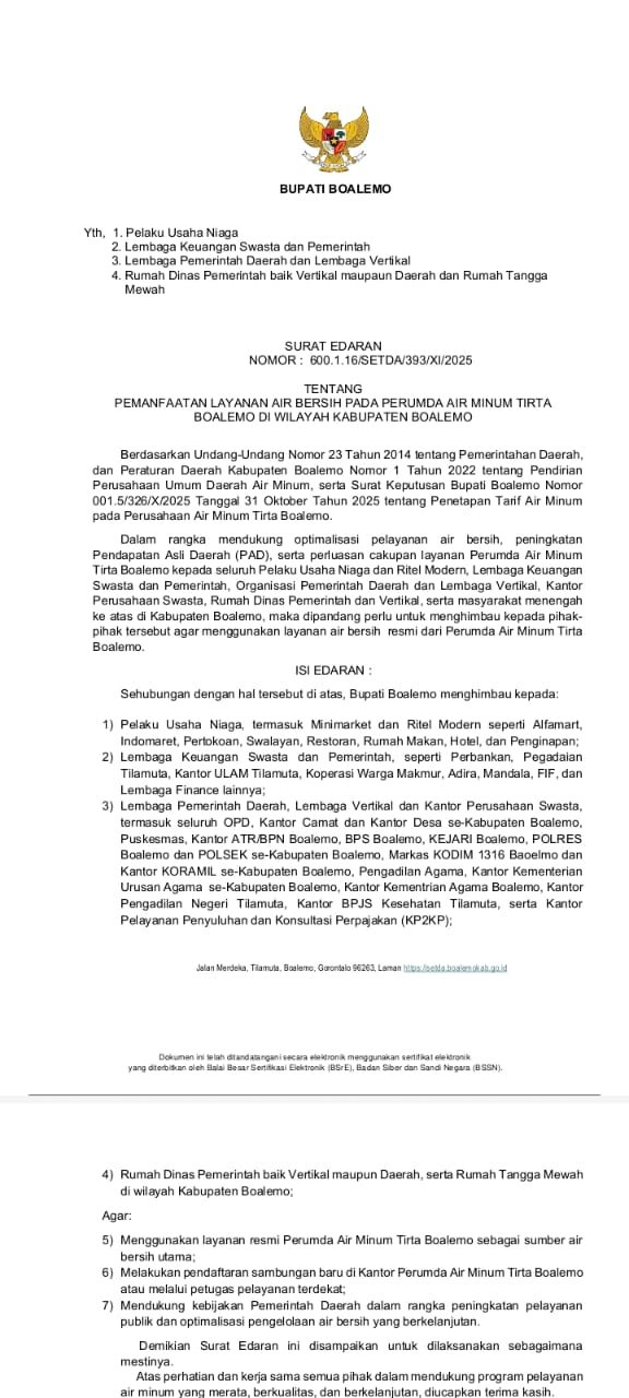 POROSNEWS.ID, Boalemo – Pemerintah Daerah Kabupaten Boalemo mengeluarkan Surat Edaran Nomor : 600.1.16SETDA/393/XI/2025 Tentang Pemanfaatan Layanan Air Bersih pada Perunda Air Minum Tirta Boalemo di wilayah Kabupaten Boalemo tertanggal 10 November 2025.